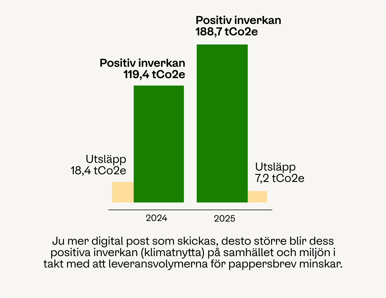 Volymerna av digital post har ökat ytterligare under året. Kivras totala koldioxidavtryck kommer sannolikt att öka i framtiden i takt med att Kivra växer som företag och att antalet anställda ökar. Ju mer digital post Kivra levererar till konsumenter, desto större blir den positiva miljöpåverkan, och relativt sett minskar Kivras koldioxidavtryck som företag. Kivras verksamhet genererar en positiv klimateffekt i takt med att den växer genom att minska behovet av avverkning av träd för pappersproduktion, utsläpp från postdistribution i trafiken samt hantering av papperspost.