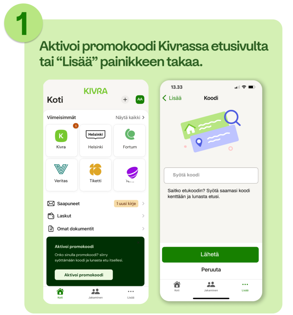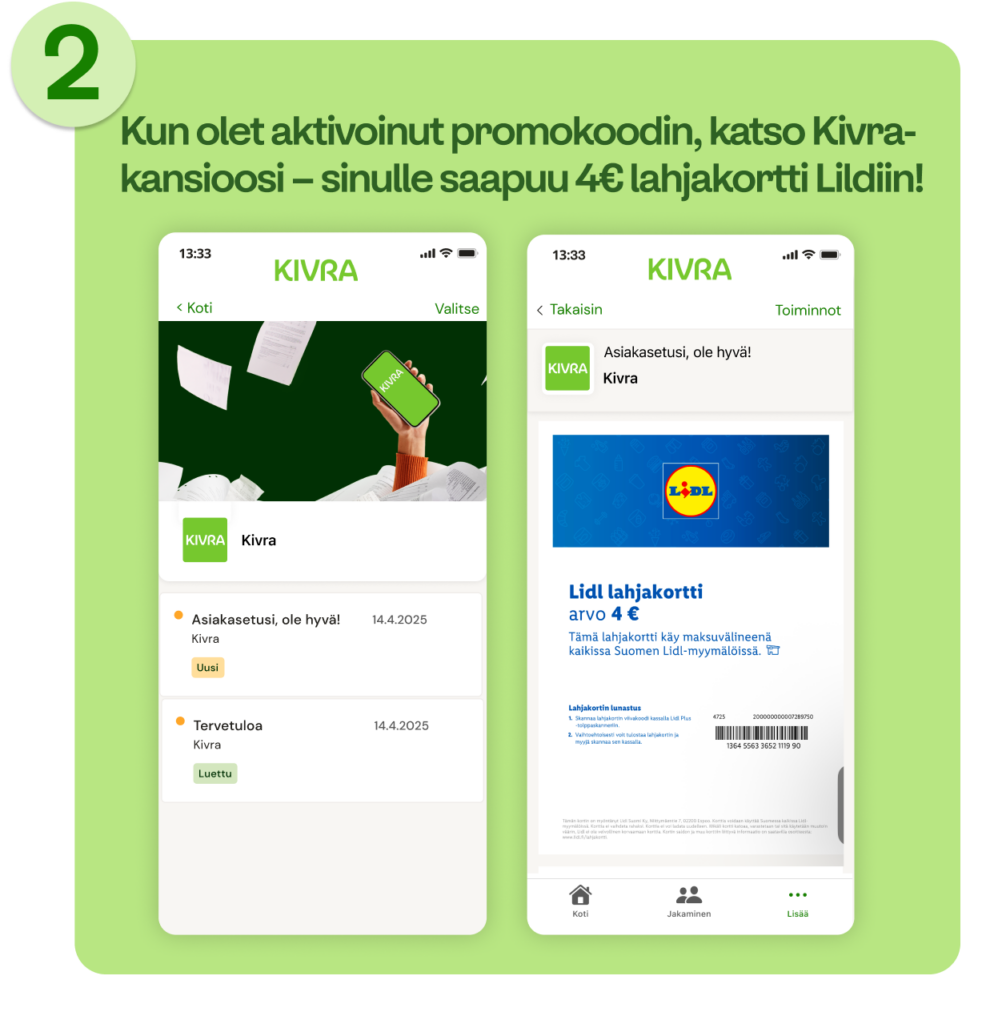 Ota Kivra käyttöösi nyt ja lunasta Kirvassa promokoodilla LIDL11 lahjakortti Lidliin. Lahjakortti on arvoltaan 4€. Lahjakortti toimitetaan Kivraan heti promootiokoodin lunastamisen jälkeen. Promokoodi tulee lunastaa Kivrassa 72 tunnin sisällä rekisteröitymisestä. Lunasta etu heti palvelun käyttöönoton jälkeen.