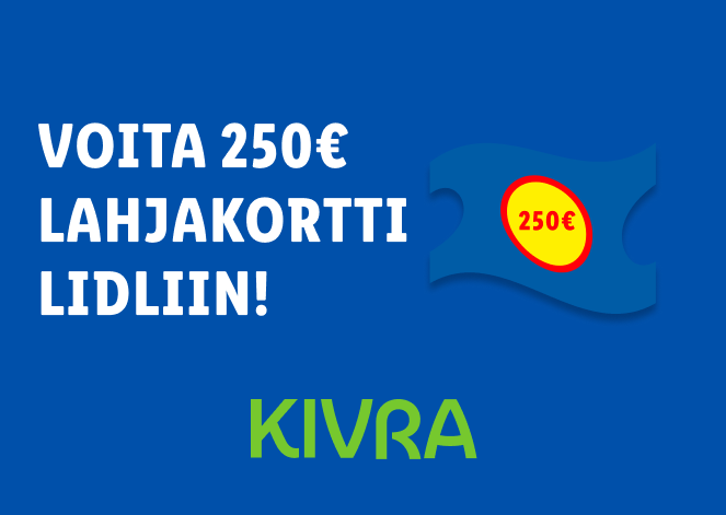 Kaikki kampanja-aikana 6.-30.11.2025 Kivraan rekisteröityvät ja yhteystietonsa lomakkeelle jättävät osallistuvat arvontaan, jossa palkintona on 250 € Lidl lahjakortti. Arvonta suoritetaan 1.12.2025. Voittajalle ilmoitetaan henkilökohtaisesti, ja palkinto toimitetaan Kivraan. Palkintoa ei voi vaihtaa tai muuttaa rahaksi. Arvonnan järjestää Kivra Oy, joka vastaa myös arpajaisveron maksamisesta. Järjestäjä pidättää oikeuden sääntömuutoksiin.