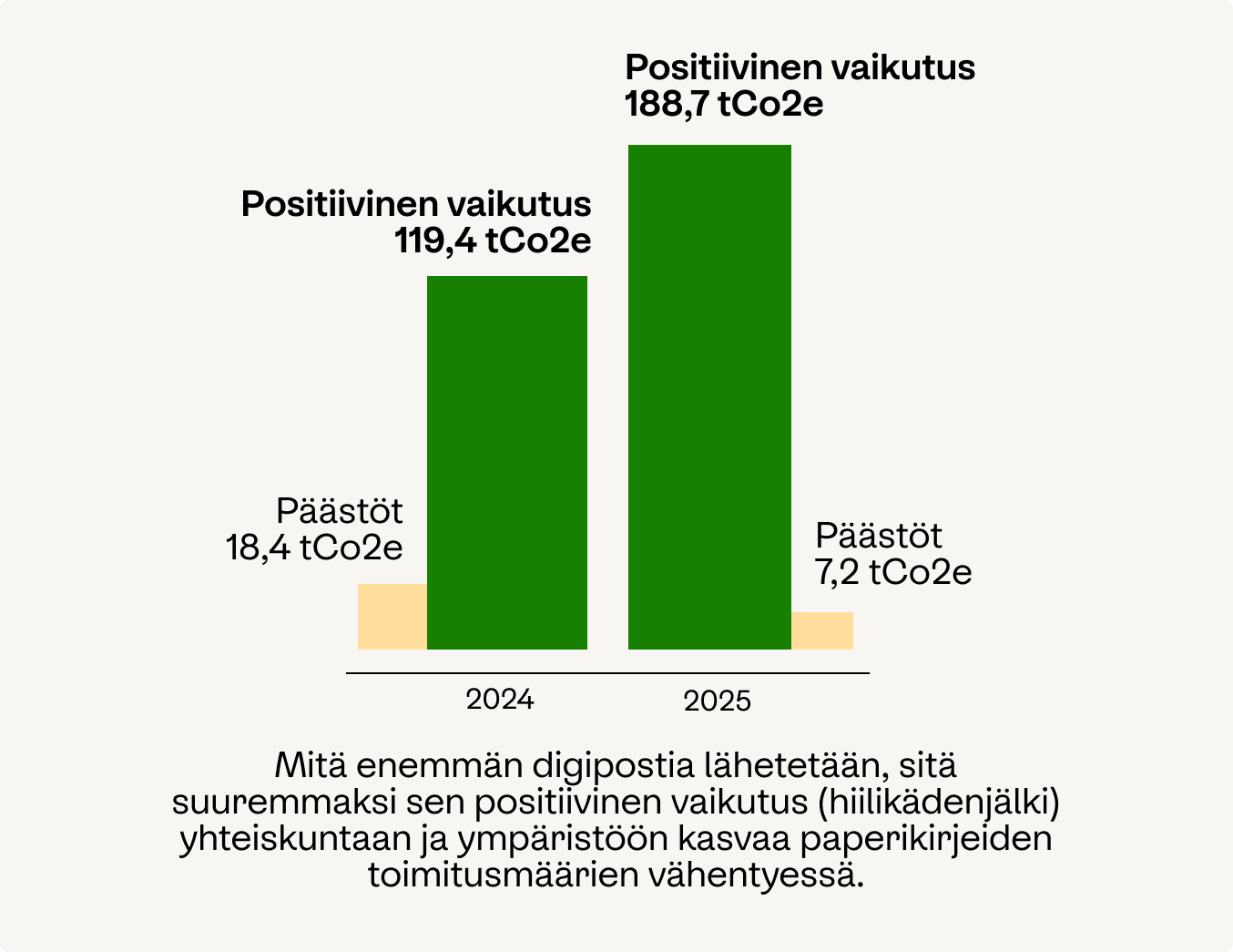 Rakennamme Suomeen kestävää, saavutettavaa ja turvallista digipostia. Mitä enemmän digipostia toimitetaan ja vastaanotetaan, sitä suurempi positiivinen vaikutus syntyy ympäristölle, ilmastolle ja kuluttajien arkeen.